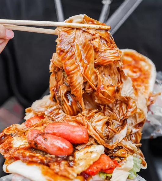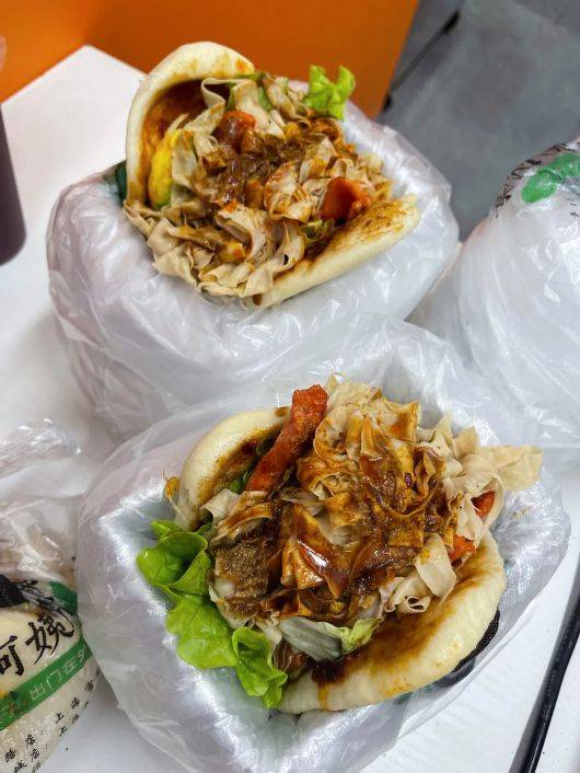 米白色的月亮馍经过店员的一双巧手,竟能装下鸡蛋、烤肠、生菜、豆皮等多种食物。